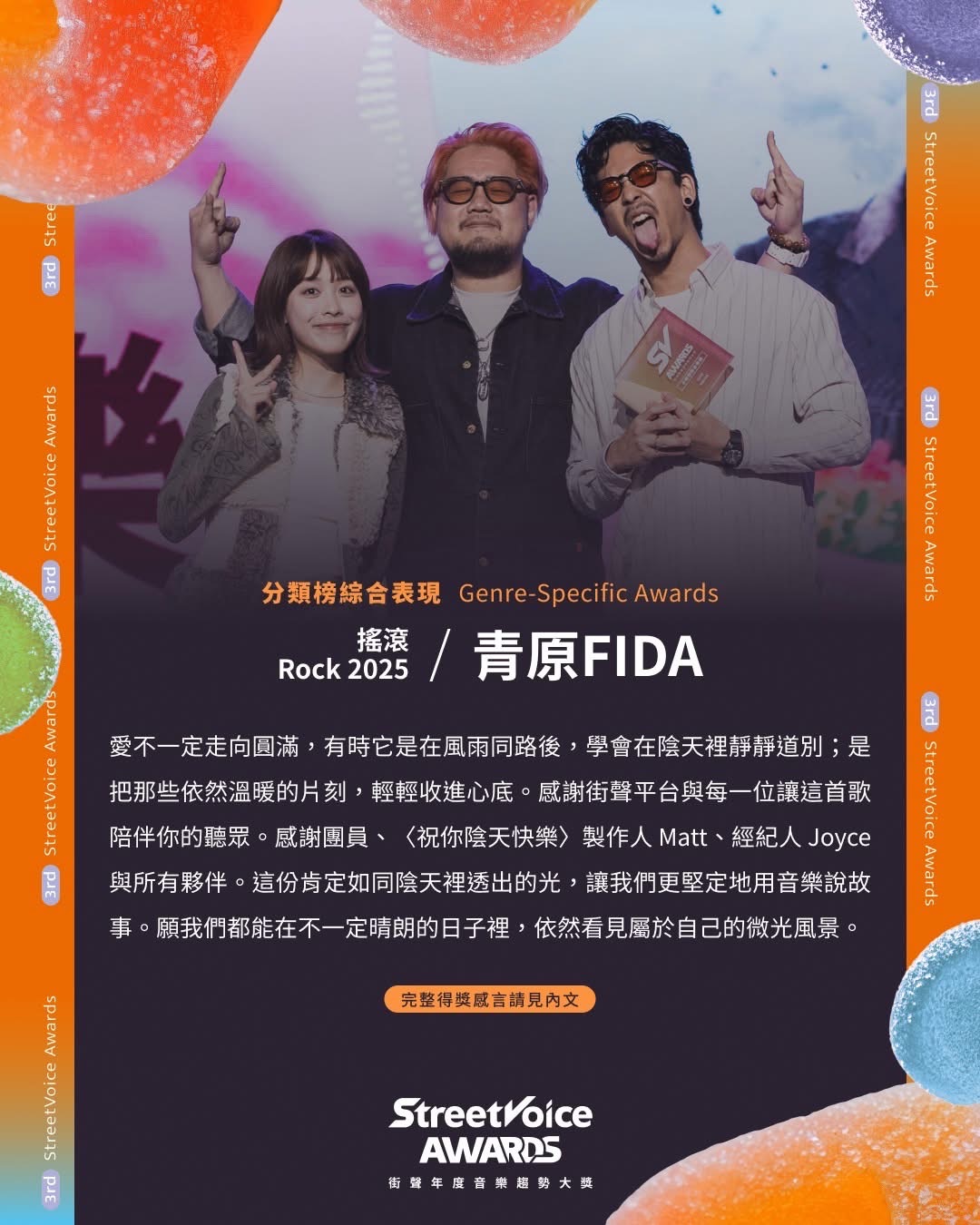 非常荣幸能凭〈祝你阴天快乐〉获得“年度摇滚分类榜综合表现”奖。这首歌不仅献给在阴郁中前行的人,也想送给每一个心中曾有重要之人、最终却走散的身影。